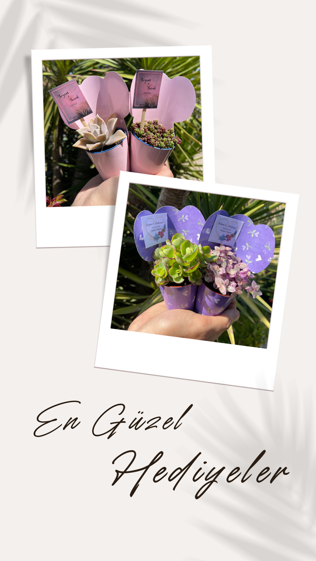 Kendi hediyelik sukulentini tasarlamak için önce yukardaki SÜSLEMELİ MİX PAKETLER bölümüne gir, istediğin desenli paketi sepete ekle daha sonra tekrar anasayfadan İSİMLİKLER bölümüne gir isimlik modelini seç istediğini yazdır!