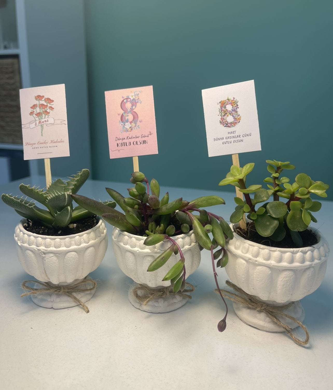 Nişan düğün,sünnet,doğum günü ve benzeri organizasyonlarınızda hediye dağıtmak için süslemeli sukulentleri sepete ekledikten sonra ayrıca isimlik bölümünden kişiye özel isimlik tasarlatabilirsiz. Almış olduğunuz Süslemeli Sukulentlere uyumlu olarak isimlik çerçevesini seçip açıklama kısmına (isim,tarih,sevgiyle büyütünüz vs) istediğiniz bilgileri yazıp bitki sayısı kadar sepete ekleyip satın alabilirsiniz. Bu konuda profesyonel olan ekibimiz kısa sürede sizin için isimlik tasarımını yapar daha sonra baskıya alır ardından kesilip çubuk yapıştırılır ve ambalajlanıp kargolanır.