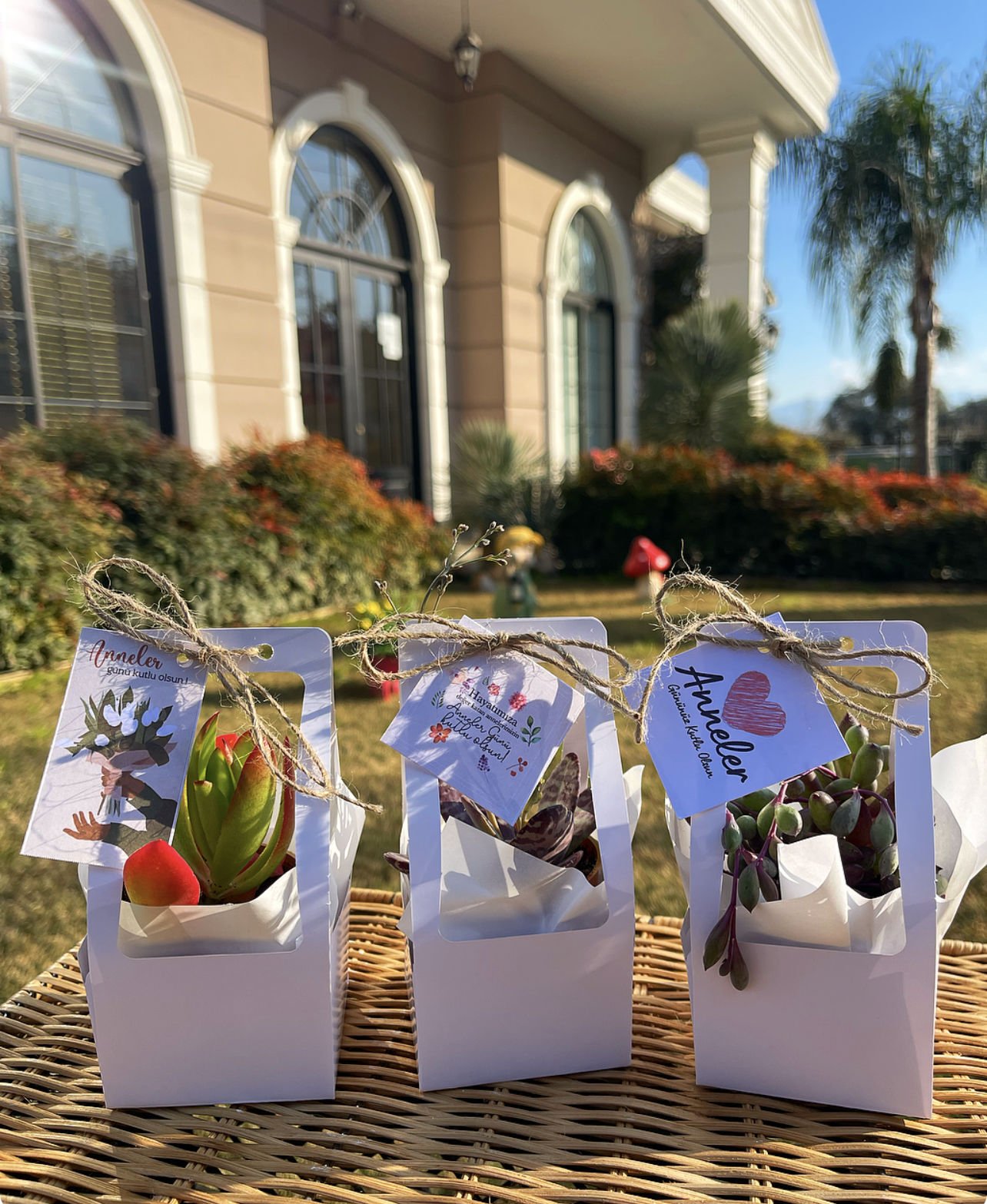 Nişan düğün,sünnet,doğum günü ve benzeri organizasyonlarınızda hediye dağıtmak için süslemeli sukulentleri sepete ekledikten sonra ayrıca isimlik bölümünden kişiye özel isimlik tasarlatabilirsiz. Almış olduğunuz Süslemeli Sukulentlere uyumlu olarak isimlik çerçevesini seçip açıklama kısmına (isim,tarih,sevgiyle büyütünüz vs) istediğiniz bilgileri yazıp bitki sayısı kadar sepete ekleyip satın alabilirsiniz. Bu konuda profesyonel olan ekibimiz kısa sürede sizin için isimlik tasarımını yapar daha sonra baskıya alır ardından kesilip çubuk yapıştırılır ve ambalajlanıp kargolanır.