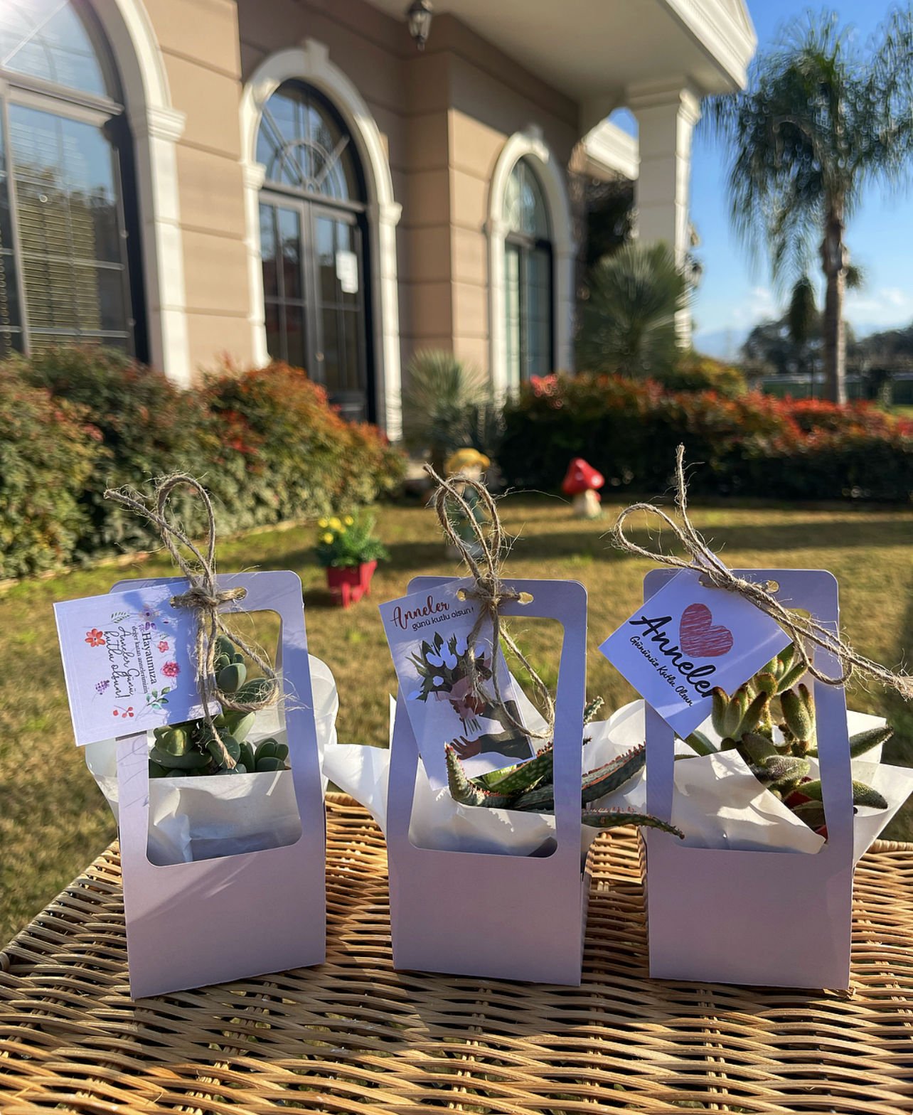 Nişan düğün,sünnet,doğum günü ve benzeri organizasyonlarınızda hediye dağıtmak için süslemeli sukulentleri sepete ekledikten sonra ayrıca isimlik bölümünden kişiye özel isimlik tasarlatabilirsiz. Almış olduğunuz Süslemeli Sukulentlere uyumlu olarak isimlik çerçevesini seçip açıklama kısmına (isim,tarih,sevgiyle büyütünüz vs) istediğiniz bilgileri yazıp bitki sayısı kadar sepete ekleyip satın alabilirsiniz. Bu konuda profesyonel olan ekibimiz kısa sürede sizin için isimlik tasarımını yapar daha sonra baskıya alır ardından kesilip çubuk yapıştırılır ve ambalajlanıp kargolanır.