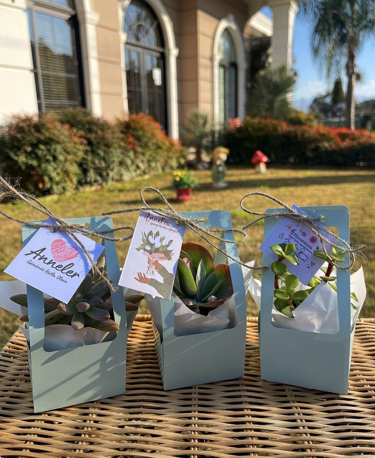 Nişan düğün,sünnet,doğum günü ve benzeri organizasyonlarınızda hediye dağıtmak için süslemeli sukulentleri sepete ekledikten sonra ayrıca isimlik bölümünden kişiye özel isimlik tasarlatabilirsiz. Almış olduğunuz Süslemeli Sukulentlere uyumlu olarak isimlik çerçevesini seçip açıklama kısmına (isim,tarih,sevgiyle büyütünüz vs) istediğiniz bilgileri yazıp bitki sayısı kadar sepete ekleyip satın alabilirsiniz. Bu konuda profesyonel olan ekibimiz kısa sürede sizin için isimlik tasarımını yapar daha sonra baskıya alır ardından kesilip çubuk yapıştırılır ve ambalajlanıp kargolanır.