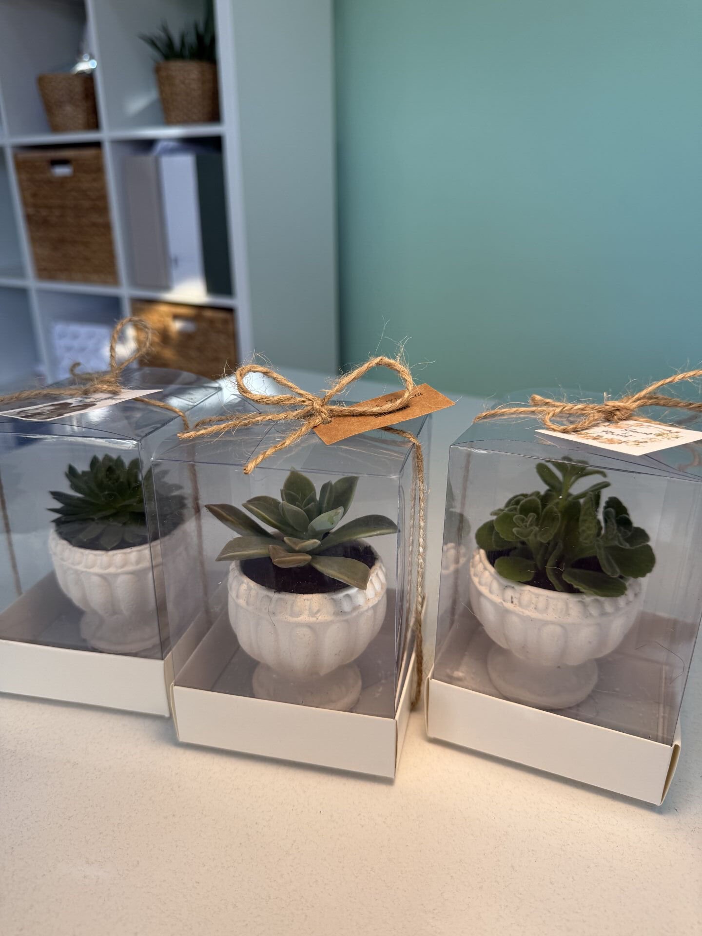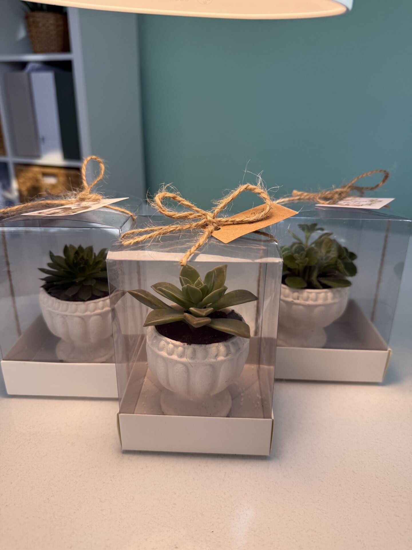 Nişan düğün,sünnet,doğum günü ve benzeri organizasyonlarınızda hediye dağıtmak için süslemeli sukulentleri sepete ekledikten sonra ayrıca isimlik bölümünden kişiye özel isimlik tasarlatabilirsiz. Almış olduğunuz Süslemeli Sukulentlere uyumlu olarak isimlik çerçevesini seçip açıklama kısmına (isim,tarih,sevgiyle büyütünüz vs) istediğiniz bilgileri yazıp bitki sayısı kadar sepete ekleyip satın alabilirsiniz. Bu konuda profesyonel olan ekibimiz kısa sürede sizin için isimlik tasarımını yapar daha sonra baskıya alır ardından kesilip çubuk yapıştırılır ve ambalajlanıp kargolanır.