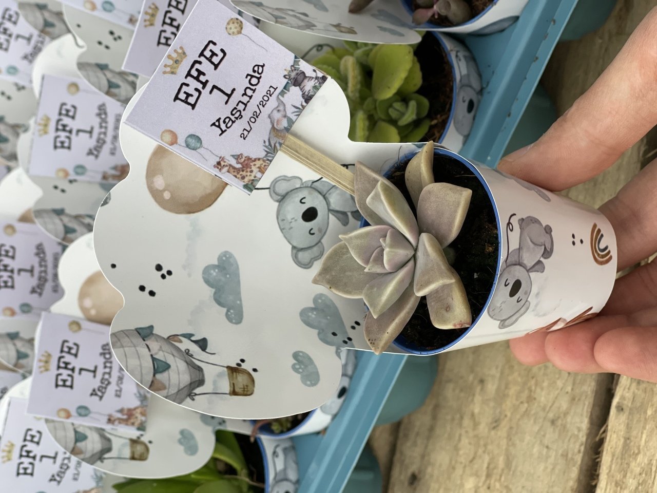 Nişan düğün,sünnet,doğum günü ve benzeri organizasyonlarınızda hediye dağıtmak için süslemeli sukulentleri sepete ekledikten sonra ayrıca isimlik bölümünden kişiye özel isimlik tasarlatabilirsiz. Almış olduğunuz Süslemeli Sukulentlere uyumlu olarak isimlik çerçevesini seçip açıklama kısmına (isim,tarih,sevgiyle büyütünüz vs) istediğiniz bilgileri yazıp bitki sayısı kadar sepete ekleyip satın alabilirsiniz. Bu konuda profesyonel olan ekibimiz kısa sürede sizin için isimlik tasarımını yapar daha sonra baskıya alır ardından kesilip çubuk yapıştırılır ve ambalajlanıp kargolanır.