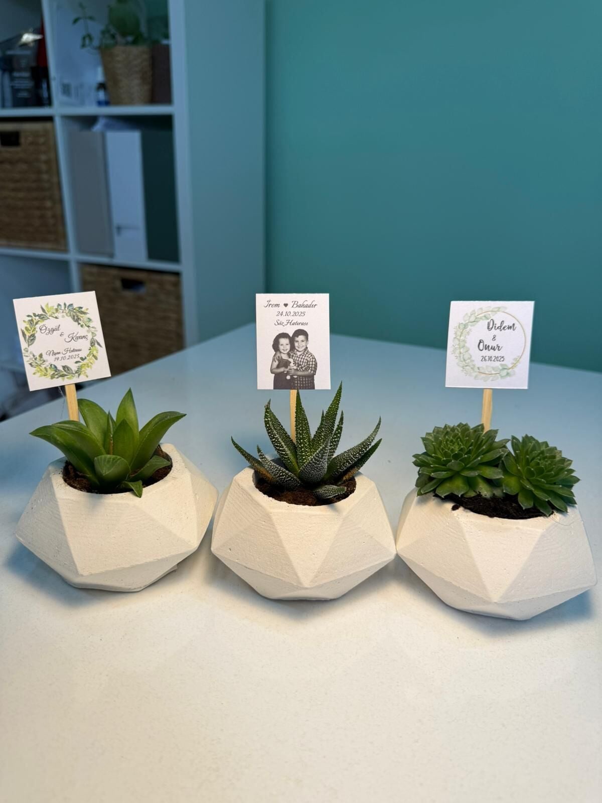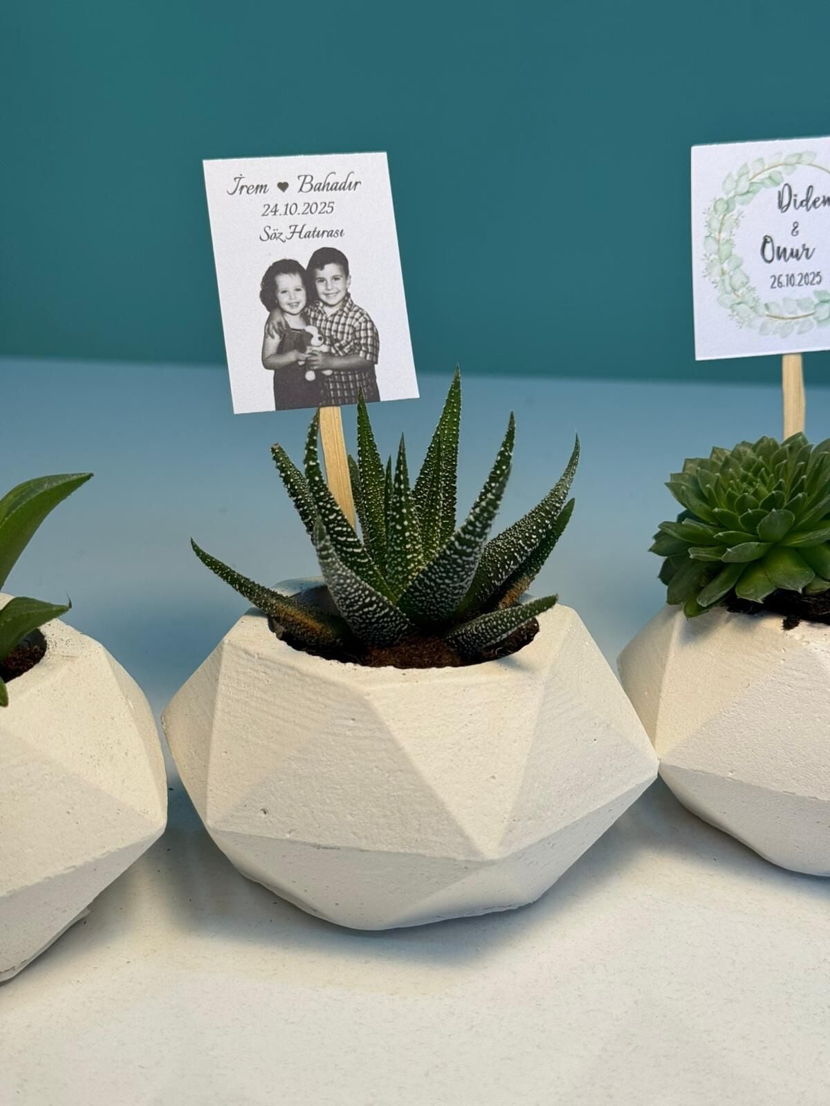 Nişan düğün,sünnet,doğum günü ve benzeri organizasyonlarınızda hediye dağıtmak için süslemeli sukulentleri sepete ekledikten sonra ayrıca isimlik bölümünden kişiye özel isimlik tasarlatabilirsiz. Almış olduğunuz Süslemeli Sukulentlere uyumlu olarak isimlik çerçevesini seçip açıklama kısmına (isim,tarih,sevgiyle büyütünüz vs) istediğiniz bilgileri yazıp bitki sayısı kadar sepete ekleyip satın alabilirsiniz. Bu konuda profesyonel olan ekibimiz kısa sürede sizin için isimlik tasarımını yapar daha sonra baskıya alır ardından kesilip çubuk yapıştırılır ve ambalajlanıp kargolanır.