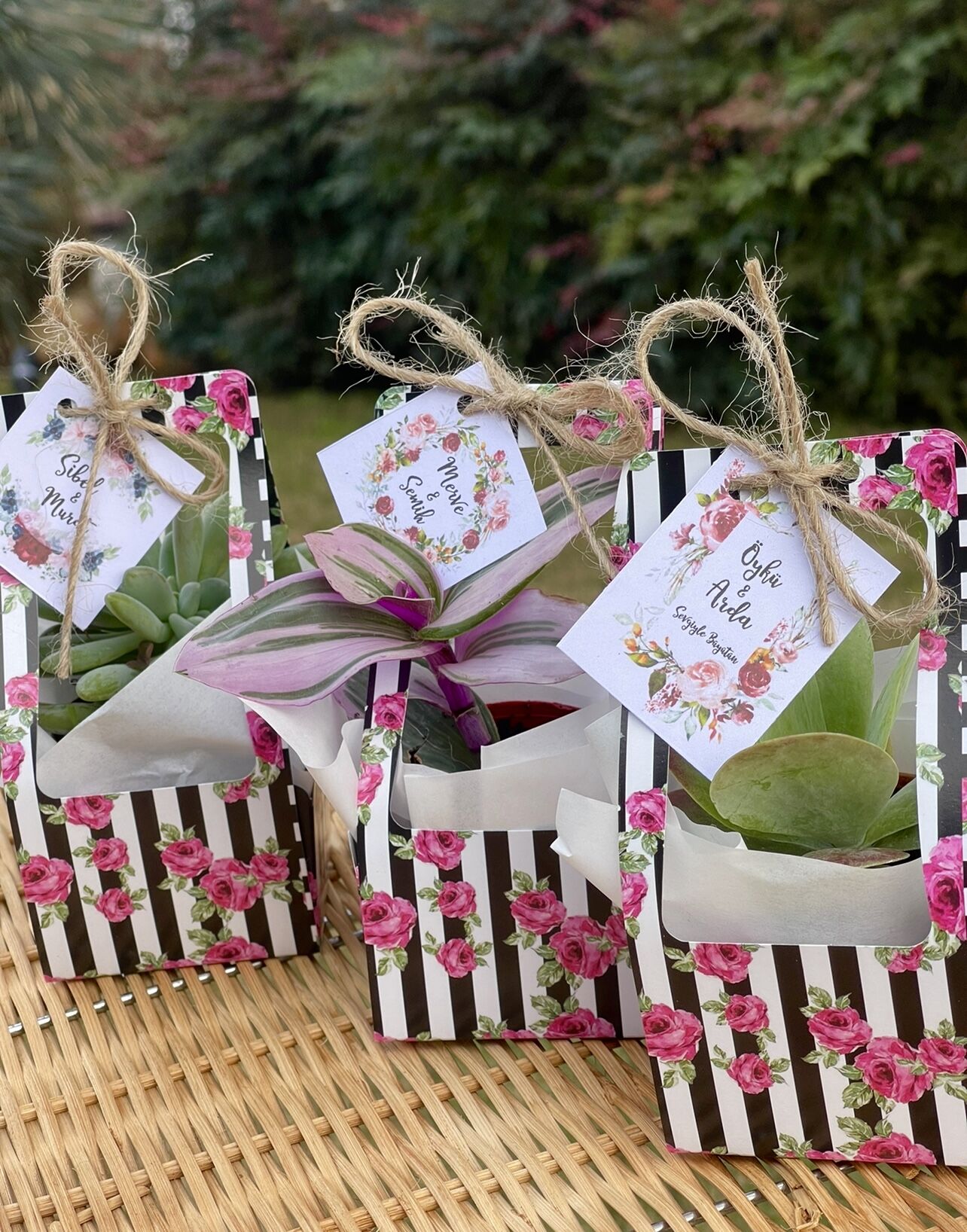 Nişan düğün,sünnet,doğum günü ve benzeri organizasyonlarınızda hediye dağıtmak için süslemeli sukulentleri sepete ekledikten sonra ayrıca isimlik bölümünden kişiye özel isimlik tasarlatabilirsiz. Almış olduğunuz Süslemeli Sukulentlere uyumlu olarak isimlik çerçevesini seçip açıklama kısmına (isim,tarih,sevgiyle büyütünüz vs) istediğiniz bilgileri yazıp bitki sayısı kadar sepete ekleyip satın alabilirsiniz. Bu konuda profesyonel olan ekibimiz kısa sürede sizin için isimlik tasarımını yapar daha sonra baskıya alır ardından kesilip çubuk yapıştırılır ve ambalajlanıp kargolanır.