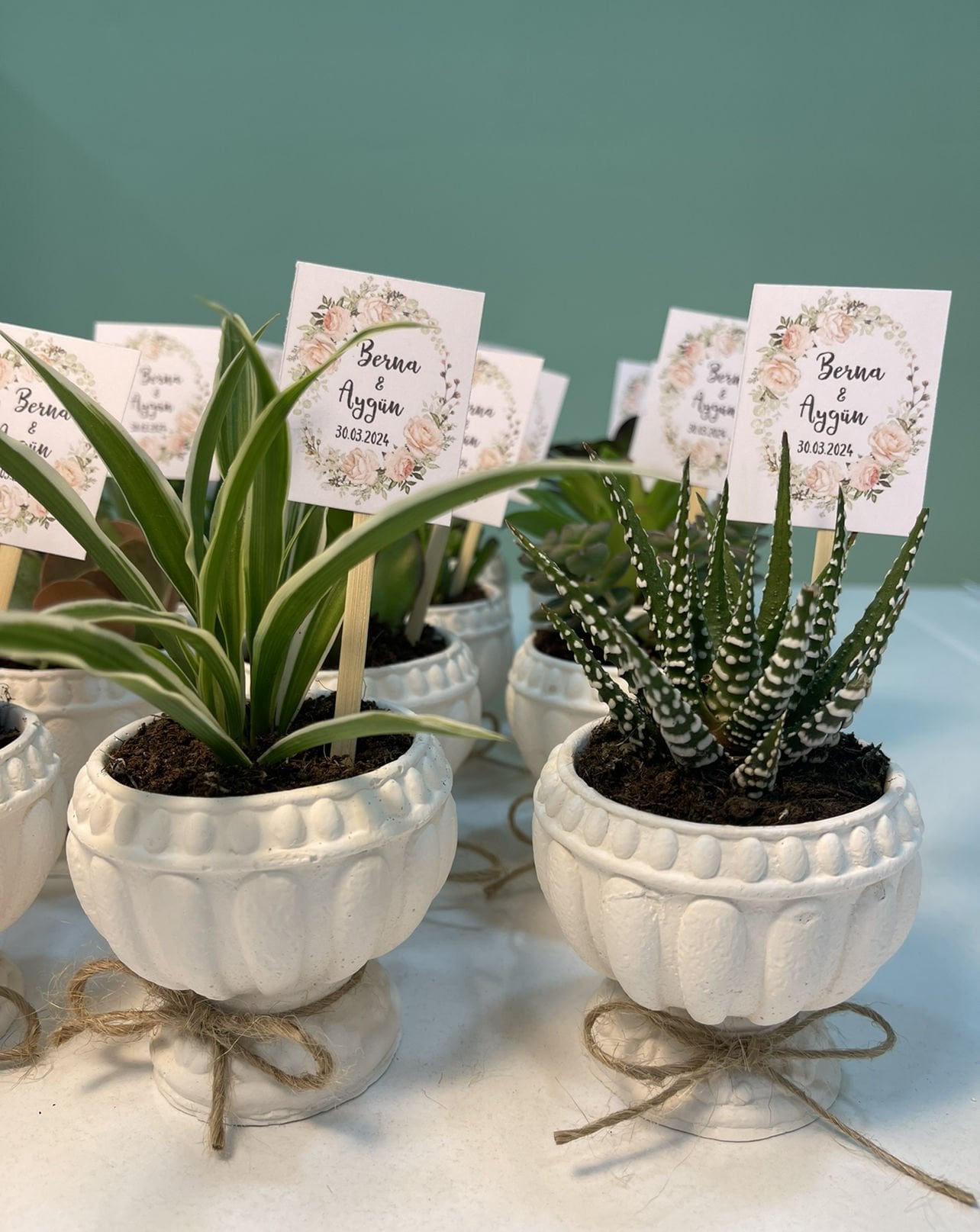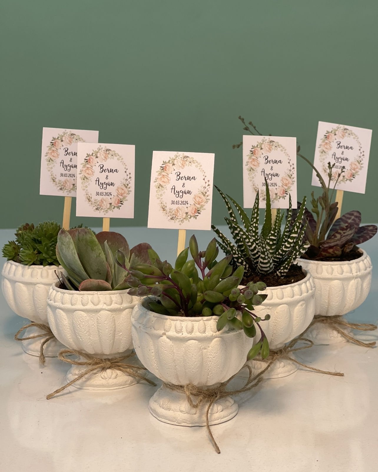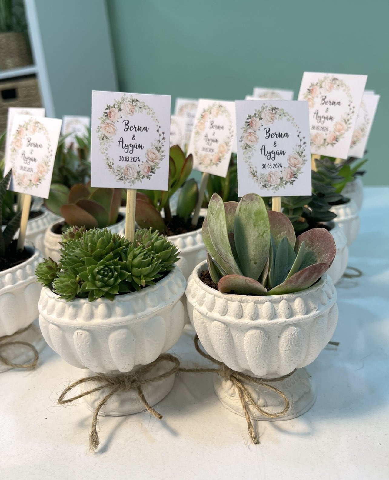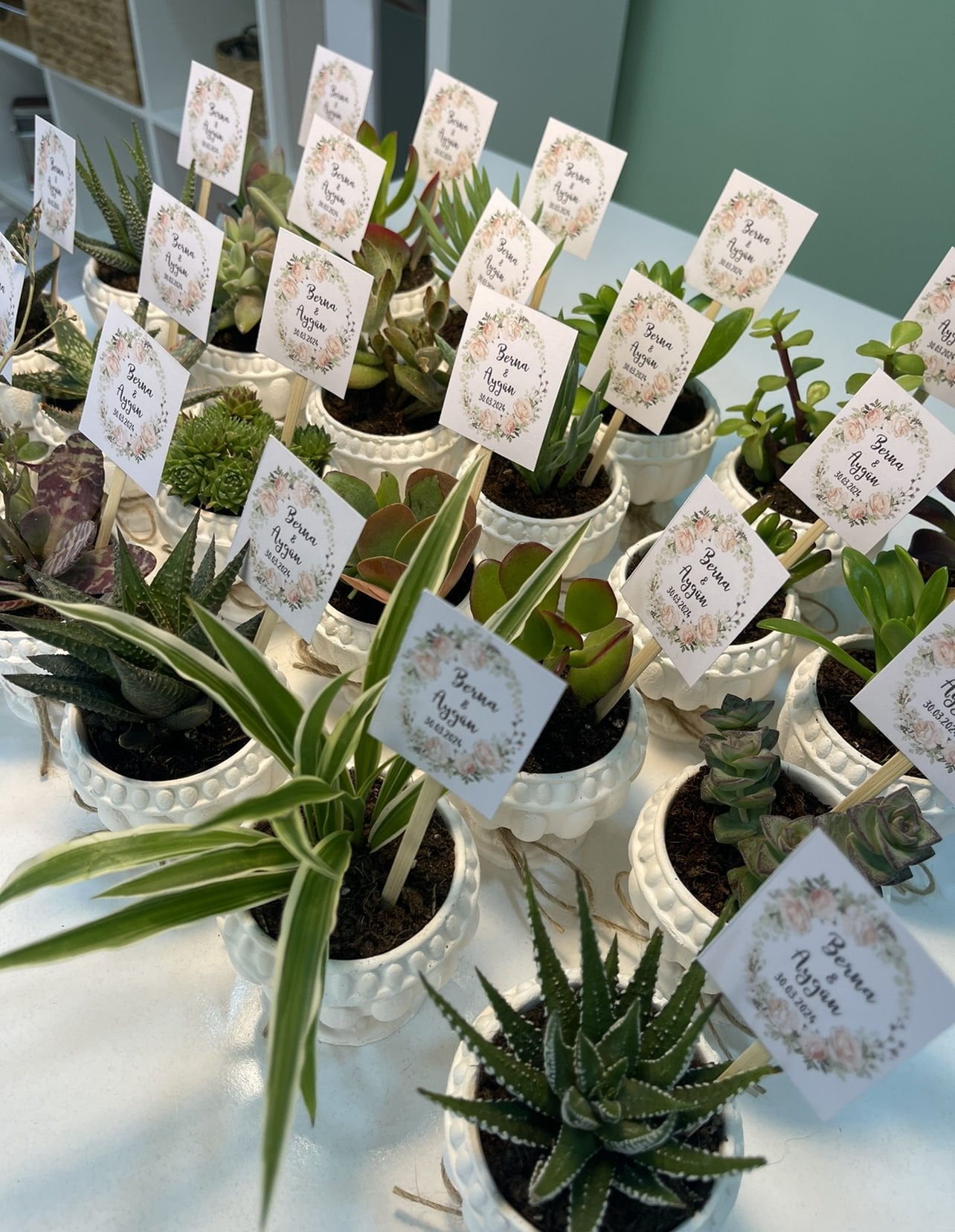 Nişan düğün,sünnet,doğum günü ve benzeri organizasyonlarınızda hediye dağıtmak için süslemeli sukulentleri sepete ekledikten sonra ayrıca isimlik bölümünden kişiye özel isimlik tasarlatabilirsiz. Almış olduğunuz Süslemeli Sukulentlere uyumlu olarak isimlik çerçevesini seçip açıklama kısmına (isim,tarih,sevgiyle büyütünüz vs) istediğiniz bilgileri yazıp bitki sayısı kadar sepete ekleyip satın alabilirsiniz. Bu konuda profesyonel olan ekibimiz kısa sürede sizin için isimlik tasarımını yapar daha sonra baskıya alır ardından kesilip çubuk yapıştırılır ve ambalajlanıp kargolanır.