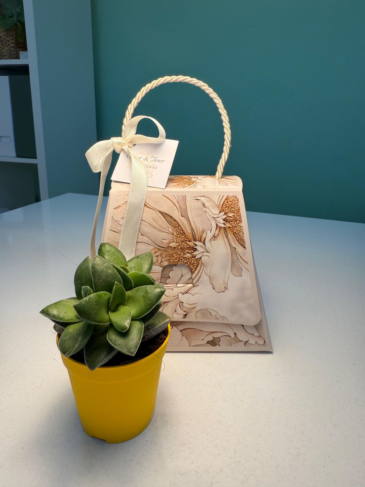 Nişan düğün,sünnet,doğum günü ve benzeri organizasyonlarınızda hediye dağıtmak için süslemeli sukulentleri sepete ekledikten sonra ayrıca isimlik bölümünden kişiye özel isimlik tasarlatabilirsiz. Almış olduğunuz Süslemeli Sukulentlere uyumlu olarak isimlik çerçevesini seçip açıklama kısmına (isim,tarih,sevgiyle büyütünüz vs) istediğiniz bilgileri yazıp bitki sayısı kadar sepete ekleyip satın alabilirsiniz. Bu konuda profesyonel olan ekibimiz kısa sürede sizin için isimlik tasarımını yapar daha sonra baskıya alır ardından kesilip çubuk yapıştırılır ve ambalajlanıp kargolanır.
