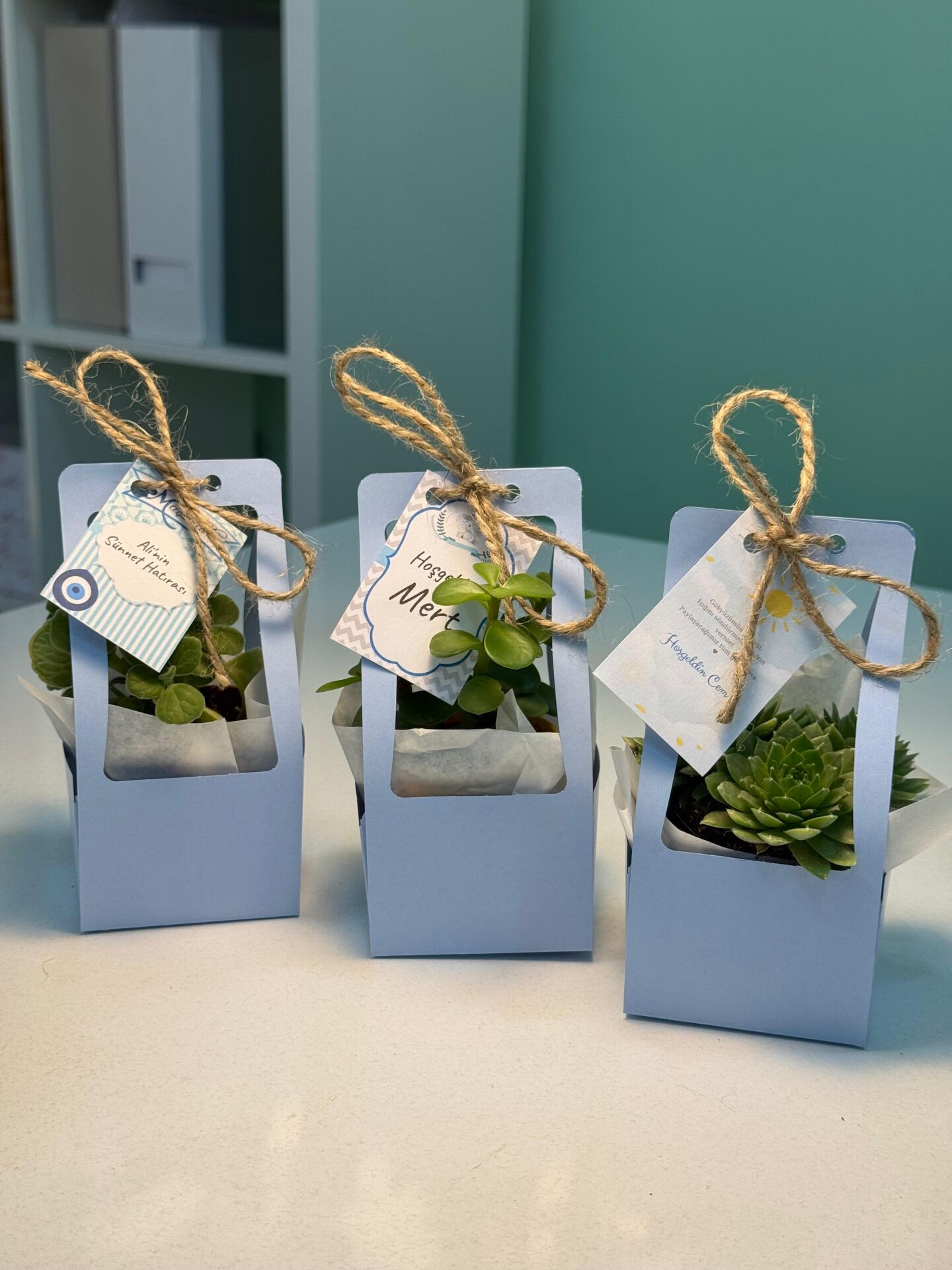 Nişan düğün,sünnet,doğum günü ve benzeri organizasyonlarınızda hediye dağıtmak için süslemeli sukulentleri sepete ekledikten sonra ayrıca isimlik bölümünden kişiye özel isimlik tasarlatabilirsiz. Almış olduğunuz Süslemeli Sukulentlere uyumlu olarak isimlik çerçevesini seçip açıklama kısmına (isim,tarih,sevgiyle büyütünüz vs) istediğiniz bilgileri yazıp bitki sayısı kadar sepete ekleyip satın alabilirsiniz. Bu konuda profesyonel olan ekibimiz kısa sürede sizin için isimlik tasarımını yapar daha sonra baskıya alır ardından kesilip çubuk yapıştırılır ve ambalajlanıp kargolanır.