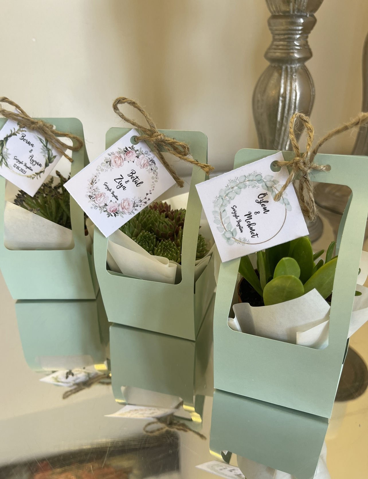 Nişan düğün,sünnet,doğum günü ve benzeri organizasyonlarınızda hediye dağıtmak için süslemeli sukulentleri sepete ekledikten sonra ayrıca isimlik bölümünden kişiye özel isimlik tasarlatabilirsiz. Almış olduğunuz Süslemeli Sukulentlere uyumlu olarak isimlik çerçevesini seçip açıklama kısmına (isim,tarih,sevgiyle büyütünüz vs) istediğiniz bilgileri yazıp bitki sayısı kadar sepete ekleyip satın alabilirsiniz. Bu konuda profesyonel olan ekibimiz kısa sürede sizin için isimlik tasarımını yapar daha sonra baskıya alır ardından kesilip çubuk yapıştırılır ve ambalajlanıp kargolanır.